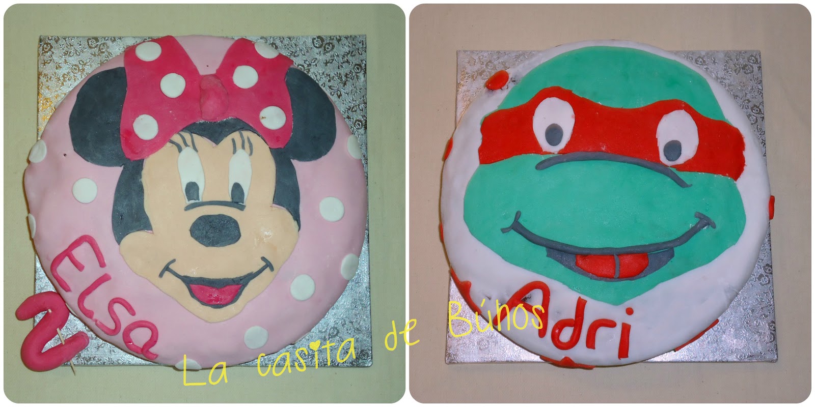 Y ya puestos a embarcarme en todo... pues una tarta fondant a conjunto. No soy para nada experta, pero con un poco de paciencia y mirándola con buenos ojos para no encontrarle los mil fallos e imperfecciones... se parecen a lo que tenían que parecerse. Y tengo que decir que incluso estaban buenas, la de Minnie de Zanahoria con icing de vainilla y la de Tortuga de chocolate con mermelada de fresa y cobertura de chocolate negro. ¡Ñam!